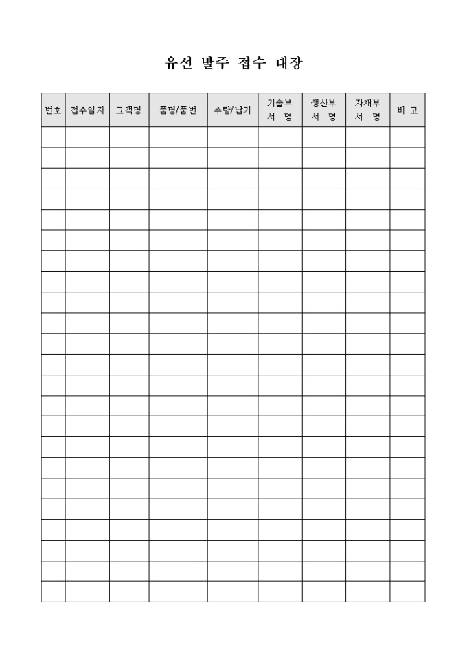 9,000원/월유선 발주 접수 대장입니다. 유선 발주 접수 내역과 납기현황등을 기록할수 있습니다.
