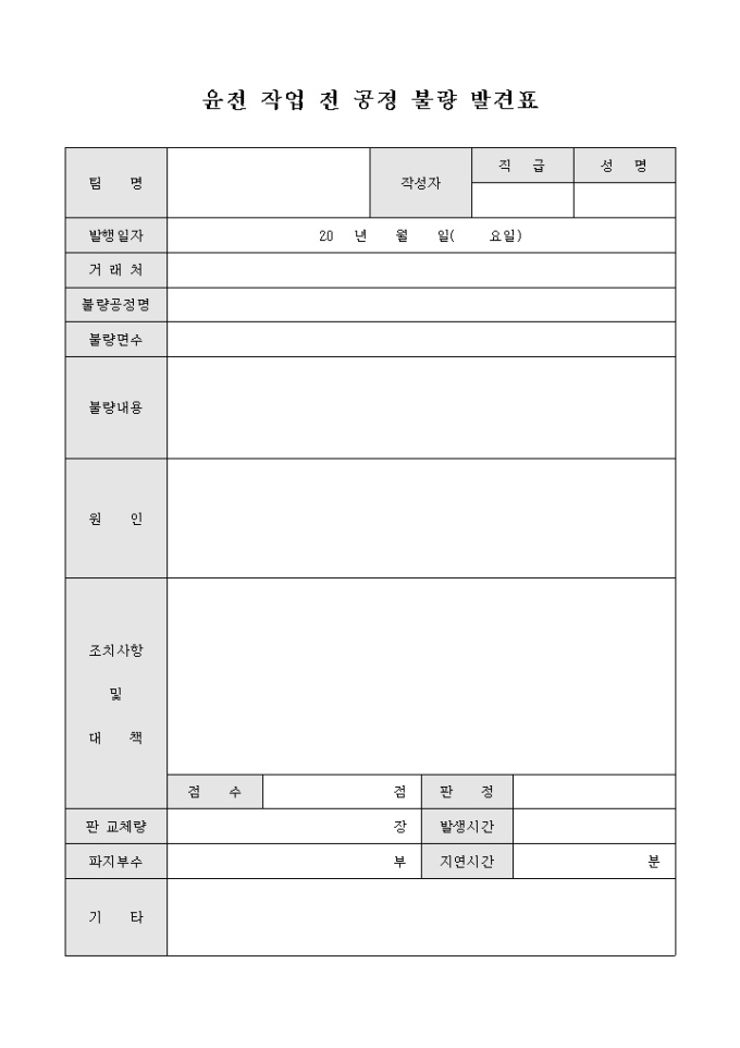 9,000원/월윤전 작업전 공정 불량 발견시 사용되는 발견표 입니다. 불량내용과 불량 원인등을 기록할수 있습니다.