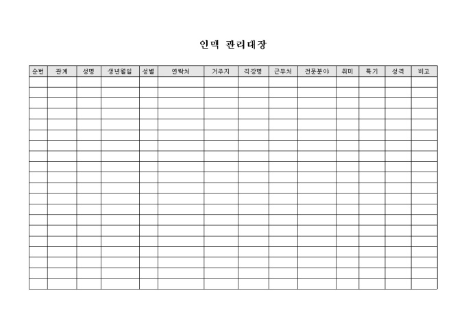 인맥을 관리할때 사용하는 관리대장 입니다. 관계와 연락처, 성격등으로 구성되어 있습니다.
