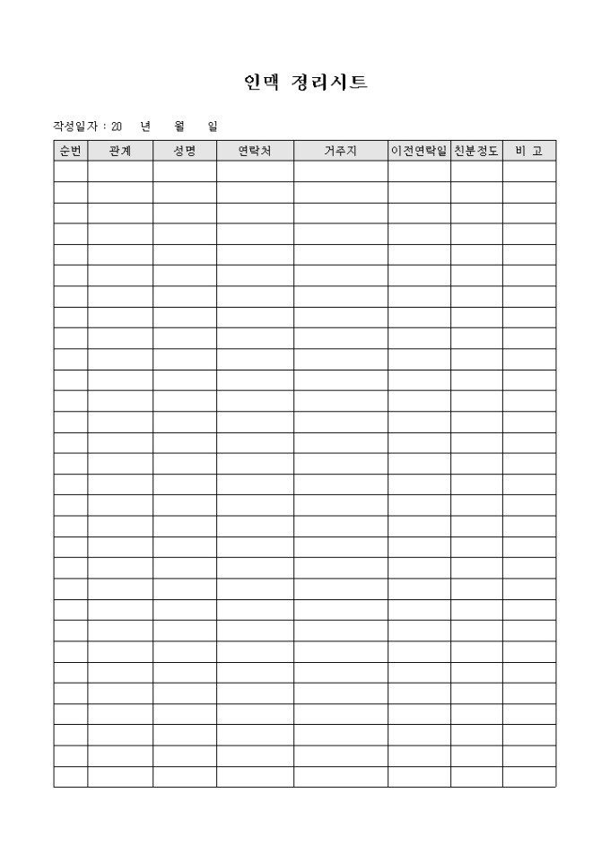 인맥정리시 사용되는 정리 시트 입니다. 관계와 거주지 연락처등을 기록할수 있습니다. 친분정도 기입할수 있습니다.