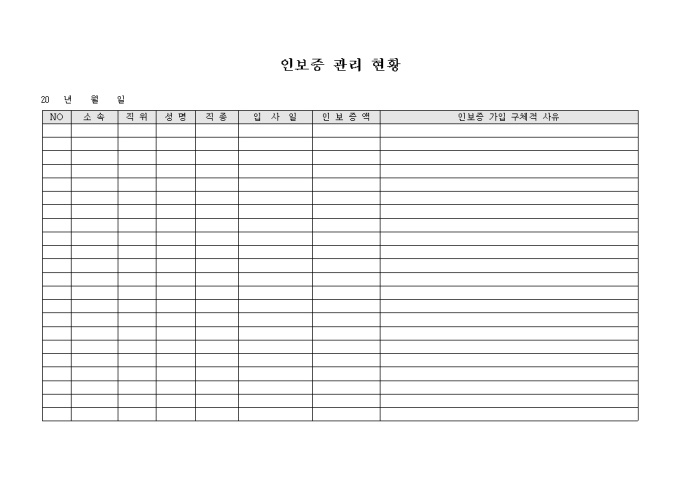 인보증 가입의 구체적인 사유와 인보증 액등을 기록하여 관리할수 있는 인보증 관리현황표 입니다.