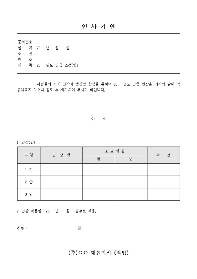 임금인상을 적용하고자 할때 사용하는 인사기안 문서 입니다.