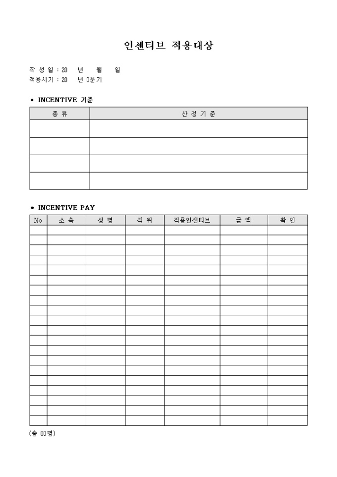 9,000원/월인센티브의 기준과 금액등을 기록할수 있으며 분기별로 인센티브 적용 대상자들을 기록할수 있는 문서입니다.