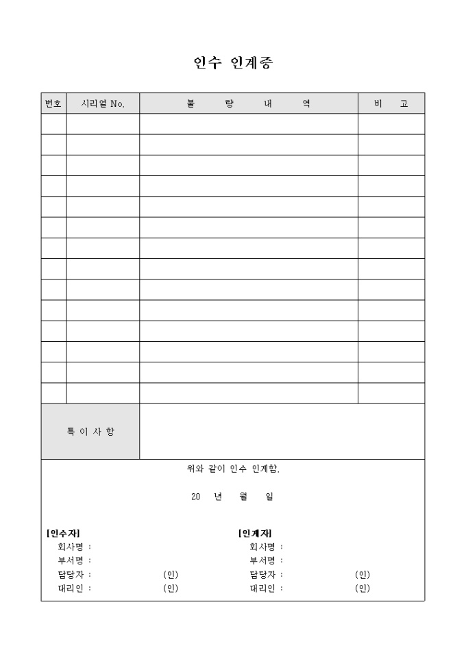 9,000원/월불량 내역에 관한 인수인계시 사용되는 증서 입니다. 시리얼 넘버와 불량 내역등을 기록할수 있습니다.