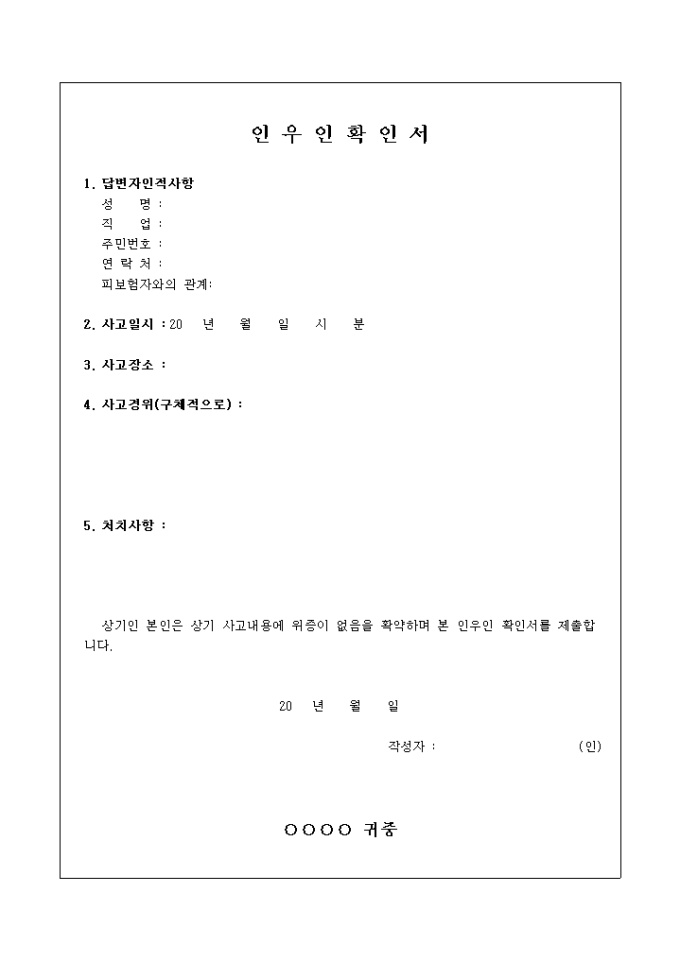 9,000원/월사고내용에 관련해 위증이 없음을 확약할때 사용하는 인우인 확인서 입니다.