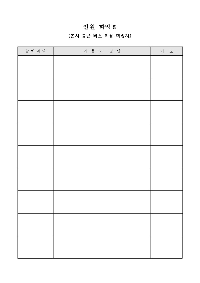 통근 버스 이용희망자의 인원현황을 파악할때 사용하는 파악표 입니다. 승차지역과 이용자의 명단등을 기록할수 있습니다.