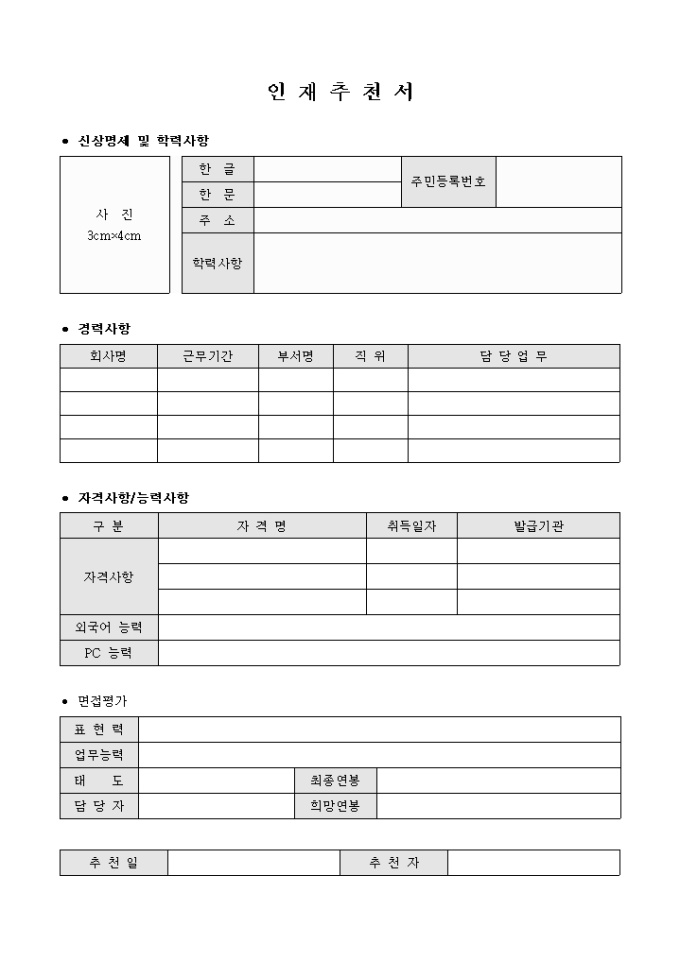 인재를 추천하고자 할때 사용하는 추천서 입니다. 경력사항과 자격사항등을 통한 능력등을 확인할수 있습니다.