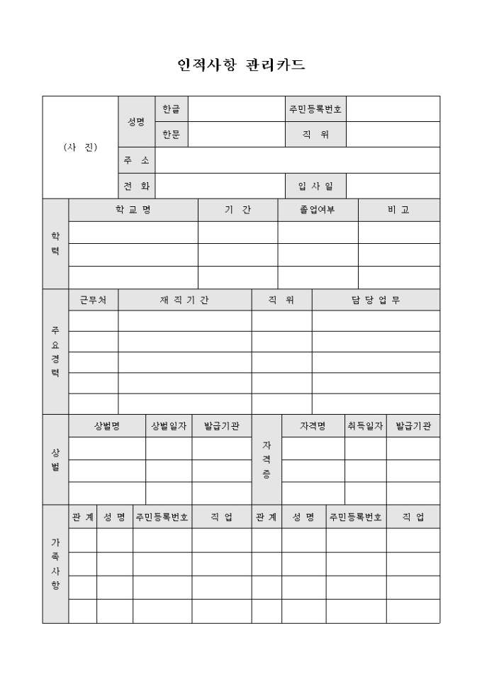 인적사항등을 관리할때 사용하는 인적사항 관리카드 입니다. 주요경력과 상벌현황, 가족사항등 개인신상 정보등으로 구성되어 있습니다.