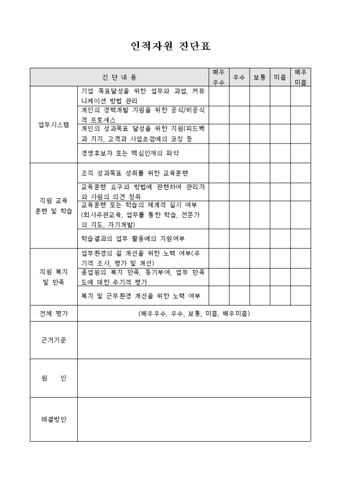 9,000원/월인적자원 진단표 입니다. 진단내용별 평가내용을 기록할때 사용하는 진단표 입니다.