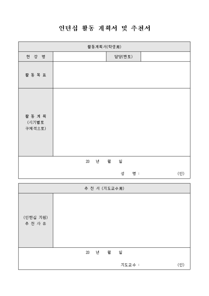 인턴십에 지원하는 학생의 활동계획과 지도교수의 추천사유등을 기록할수 있는 인턴 활동추천서 입니다.