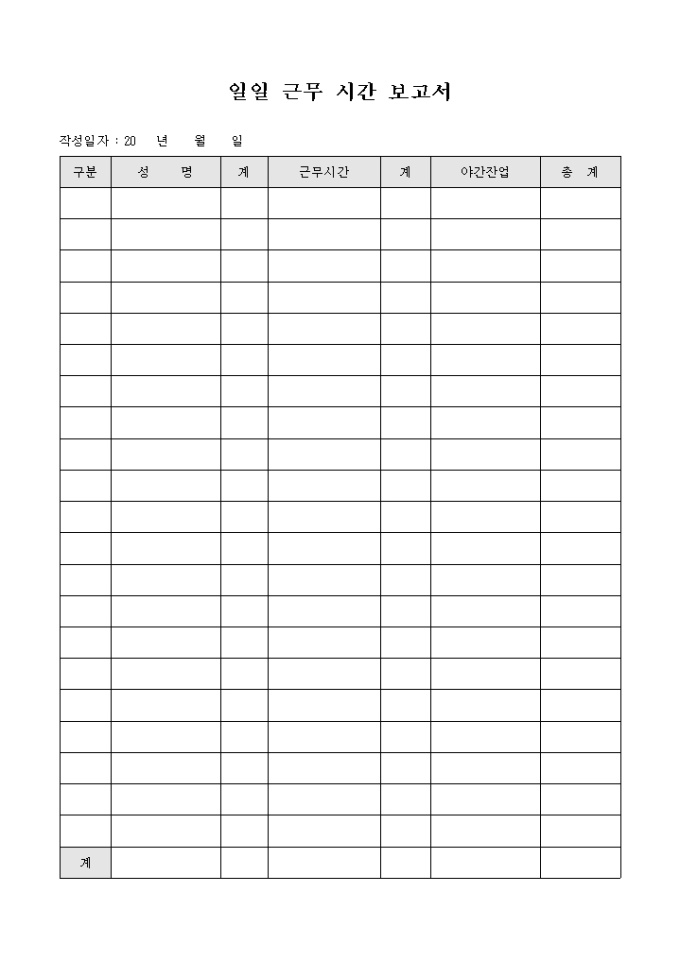 일일 근무시간과 야간작업등의 잔업시간등을 보고시 사용되는 일일 근무시간 보고서 입니다.