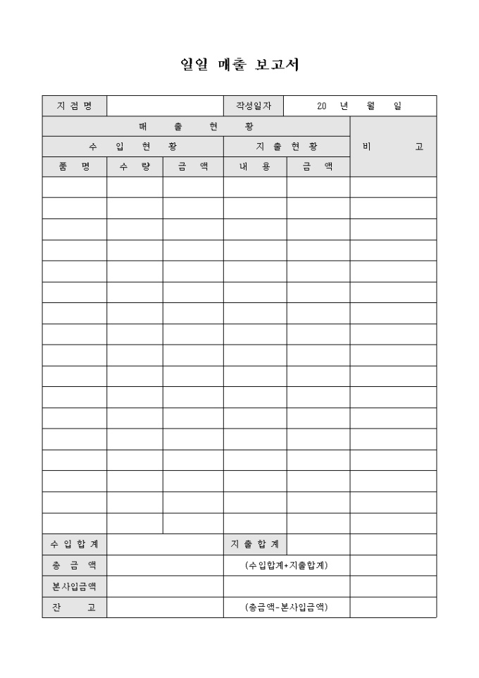 9,000원/월일일 매출현황등을 기록하고자 할때 사용하는 매출 보고서 입니다.