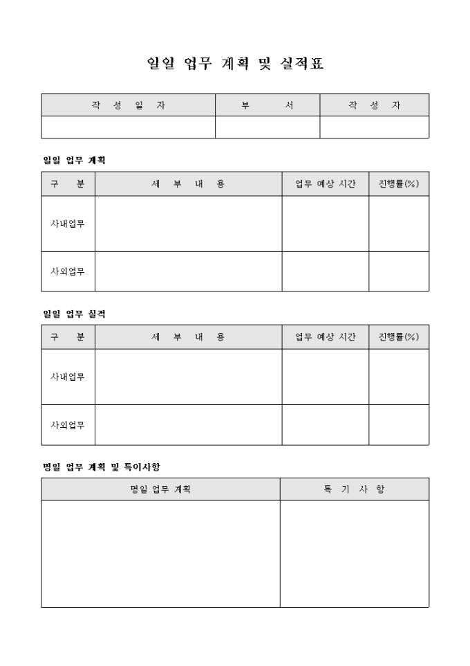 9,000원/월일일 업무 계획과 업무 실적등을 기록할수 있으며 명일 계획사항과 특이사항등을 기록할수 있는 일일 업무 계획 및 실적표 입니다.