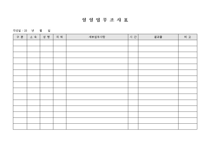 세부 업무사항과 결과물등을 기록할수 있는 일일 업무 조사표 입니다.