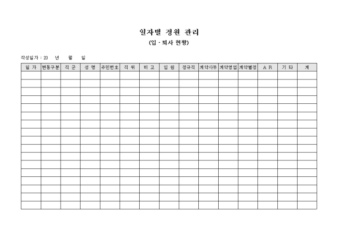 입, 퇴사현황등을 파악할때 사용합니다. 일자별로 정원관리시 사용되는 관리 문서 입니다.