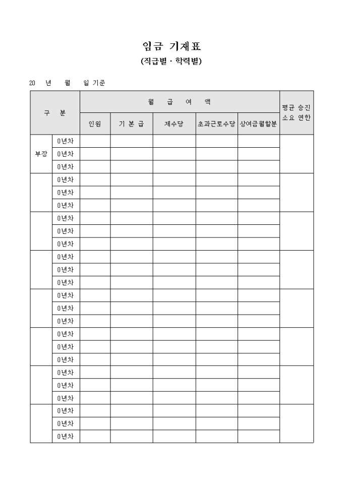 9,000원/월직급과 학력별로 구성된 임금 기재표 입니다. 월 급여액과 초과근로 수당등의 임금 기재시 사용합니다.