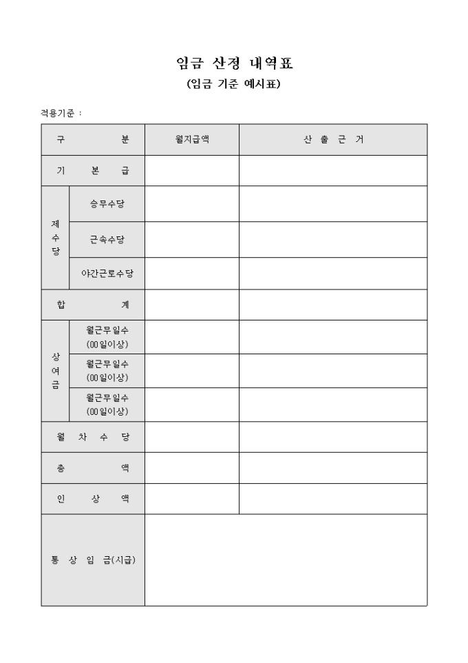 9,000원/월임금 기준 예시표 입니다. 임금산정시 산출 근거에 의한 기본급과 상여금등을 계산할수 있습니다.
