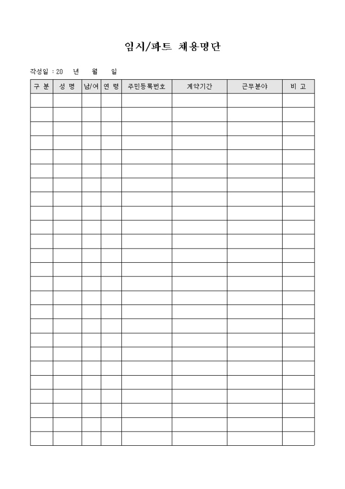 계약기간과 근무분야등을 기록할수 있으며 임시근무와 파트타임 근무시 사용할수 있는 채용명단 입니다.