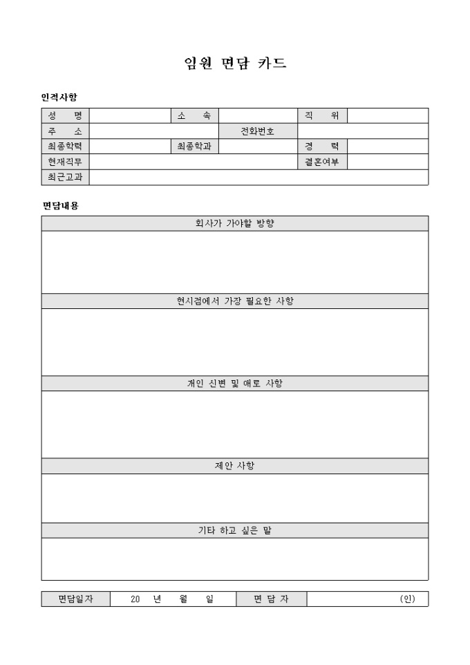임원 면담 카드입니다. 면담내용과 인적사항등으로 구성되어 있습니다.