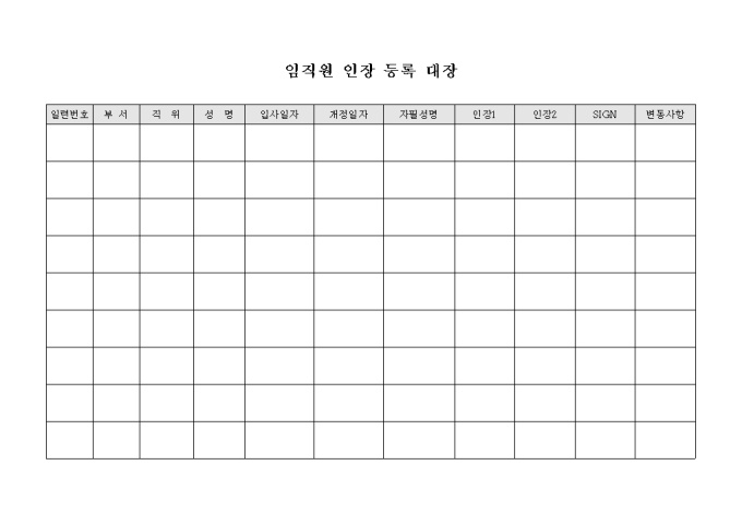 9,000원/월임직원의 인장등록시 사용하는 문서입니다. 입사일자와 개정일자, 변동사항등을 기록할수 있습니다.