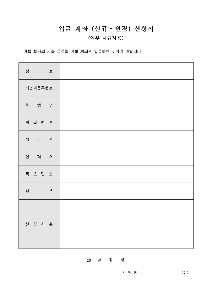 9,000원/월외부 사업자용 입금계좌 신청서 입니다. 회사지출금액의 입금을 희망할때 사용하는 신청서 입니다.