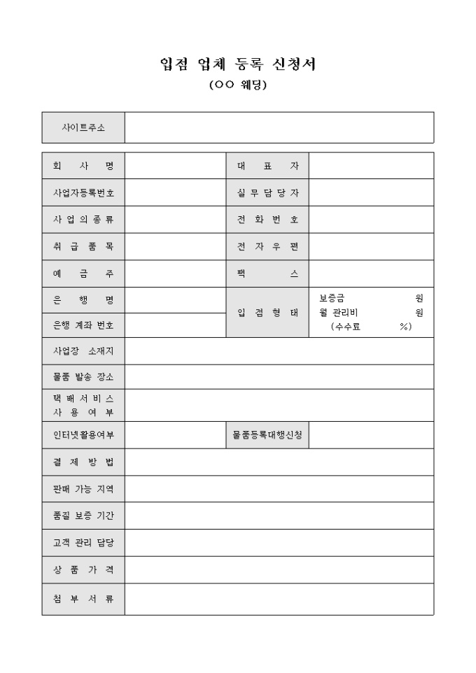 9,000원/월웨딩업체의 입점등록시 사용하는 신청서 입니다. 사이트 주소와 입점형태등을 기록할수 있습니다.