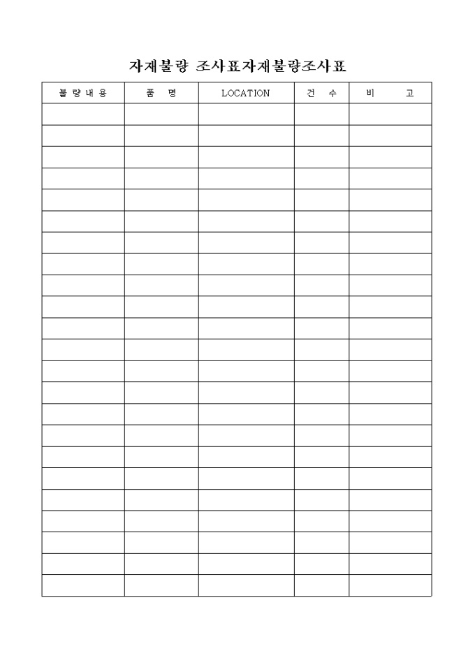 9,000원/월자재불량조사표 양식입니다. 불량내용, 품명, 불량위치, 건수등의 내용을 조사하실때 사용하십시요.
