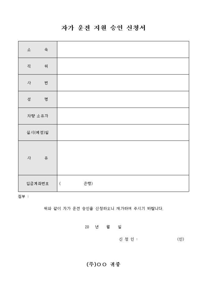 9,000원/월자가운전 지원 승인 신청서 입니다. 자가운정을 신청할때 사용합니다.