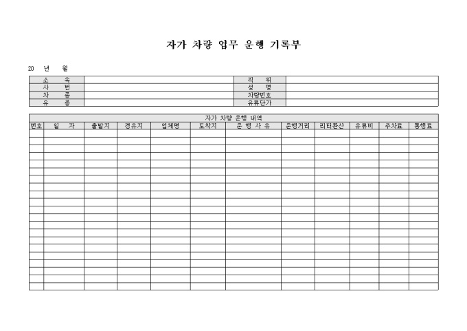 9,000원/월자가차량 업무 운행 기록부 입니다. 자가차량의 운행내역등을 기록할때 사용하는 문서입니다.
