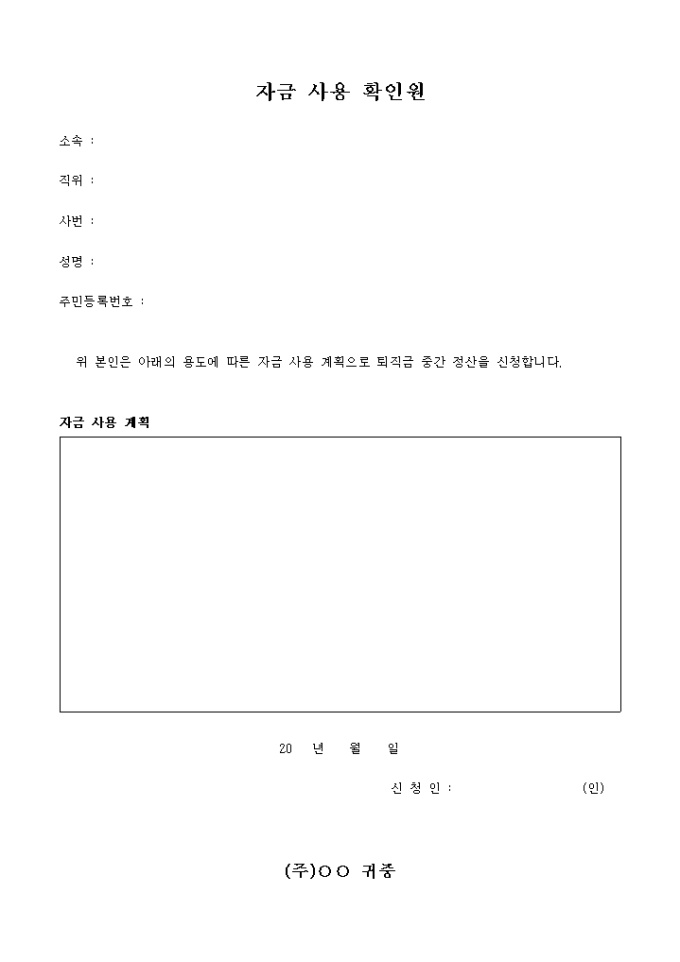 9,000원/월퇴직금 중간 정산시 사용하는 자금 사용 확인원 입니다. 자금사용계획등을 기록하여야 합니다.