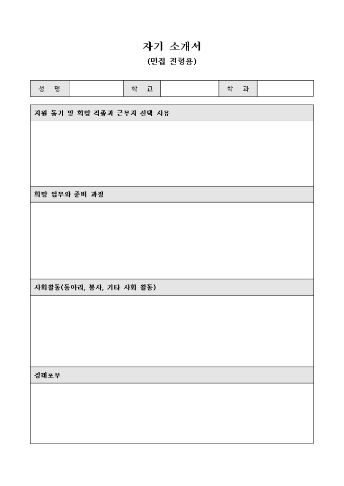 9,000원/월면접 전형용 자기 소개서 입니다. 지원 동기 및 희망 직종과 근무지 선택사유등으로 구성되어 있습니다.