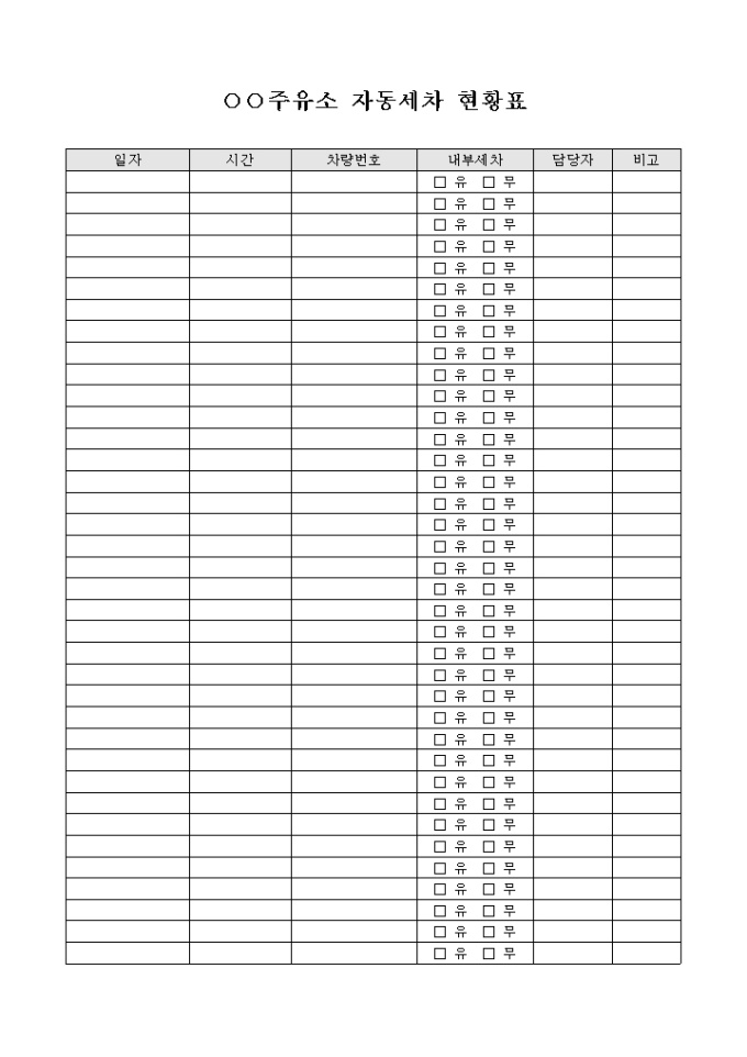 9,000원/월일자, 시간, 차량번호, 내부세차의 유무, 담당자의 사항을 기입할 수 있는 주요소 자동세차 현황표 양식입니다.