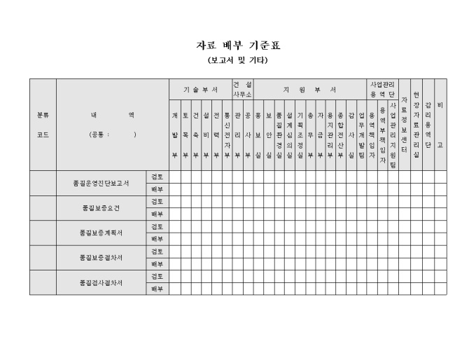 건설관련 자료배포시 기준이 되는 목록을 기록하여 볼수 있는 자료배부 기준표 입니다.