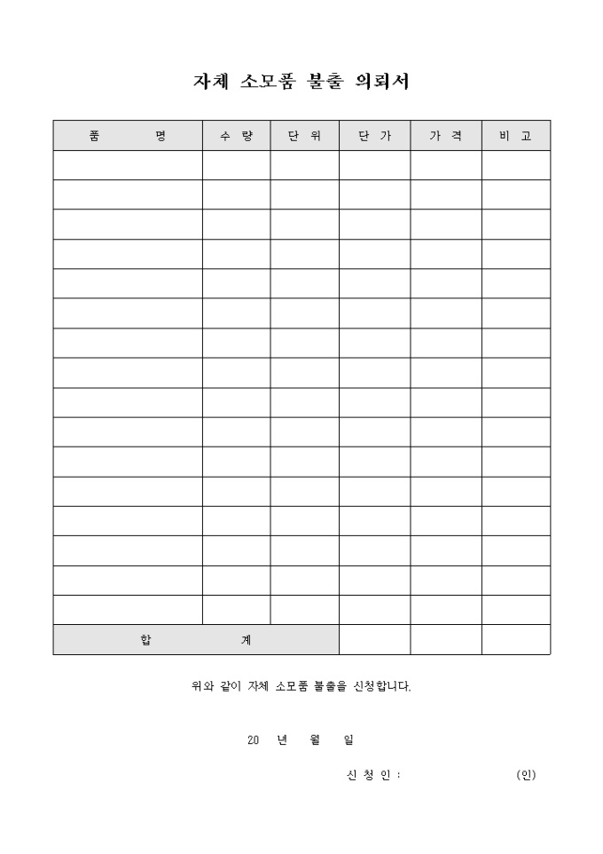 자체 소모품 불출의뢰시 사용합니다. 품명과 수량, 가격등을 기록할수 있습니다.