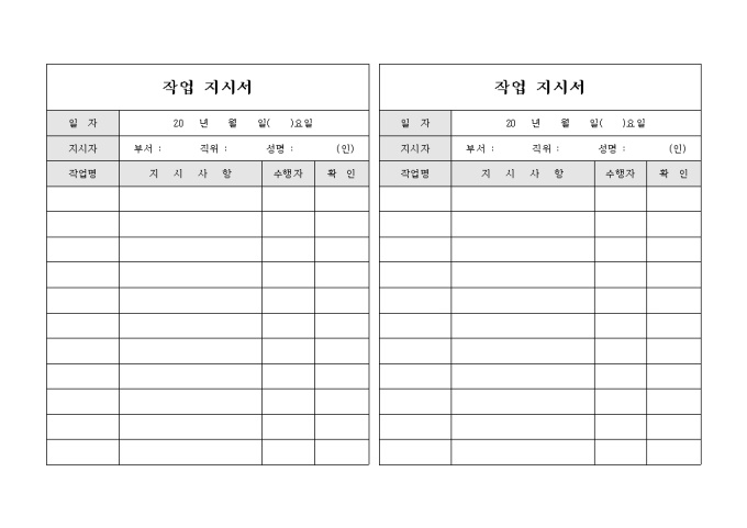 9,000원/월작업 지시서 입니다. 작업명과 지시사항, 수행자등으로 구성되어 있으며 용지절약용 입니다.