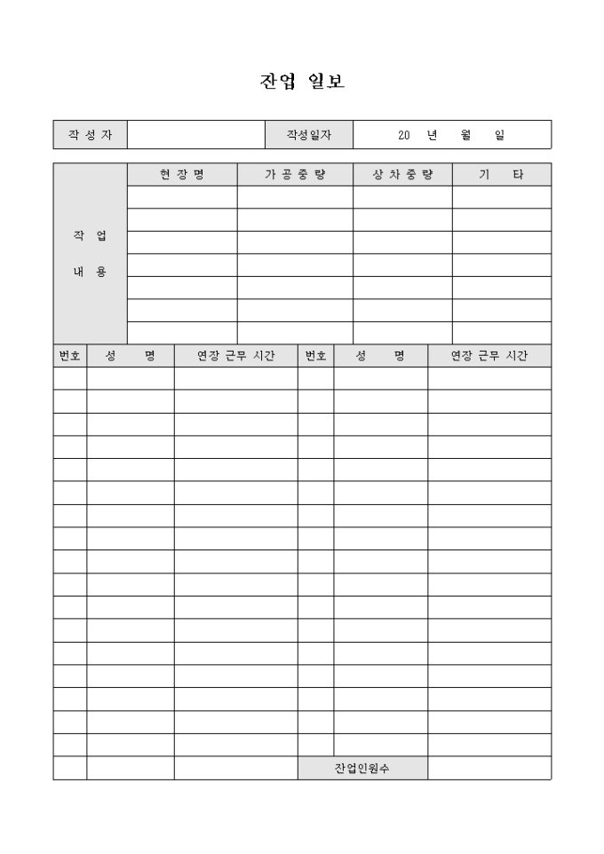 잔업일보 입니다. 현장별 작업내용등을 기록할수 있으며 연장근무 시간등을 기록할수 있습니다.