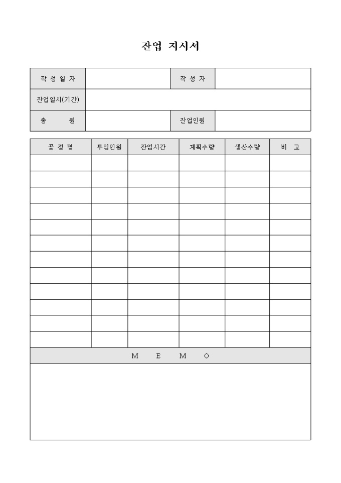 9,000원/월잔업 지시내역을 기록한 잔업지시서 입니다. 공정명에 따른 투입인원과 잔업시간등을 기록할수 있습니다.