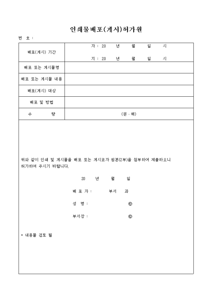 9,000원/월인쇄물 배포,게시 허가원 양식입니다.