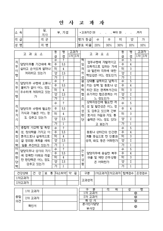 인사고과자 개인별 고과평가를 하는 양식입니다.