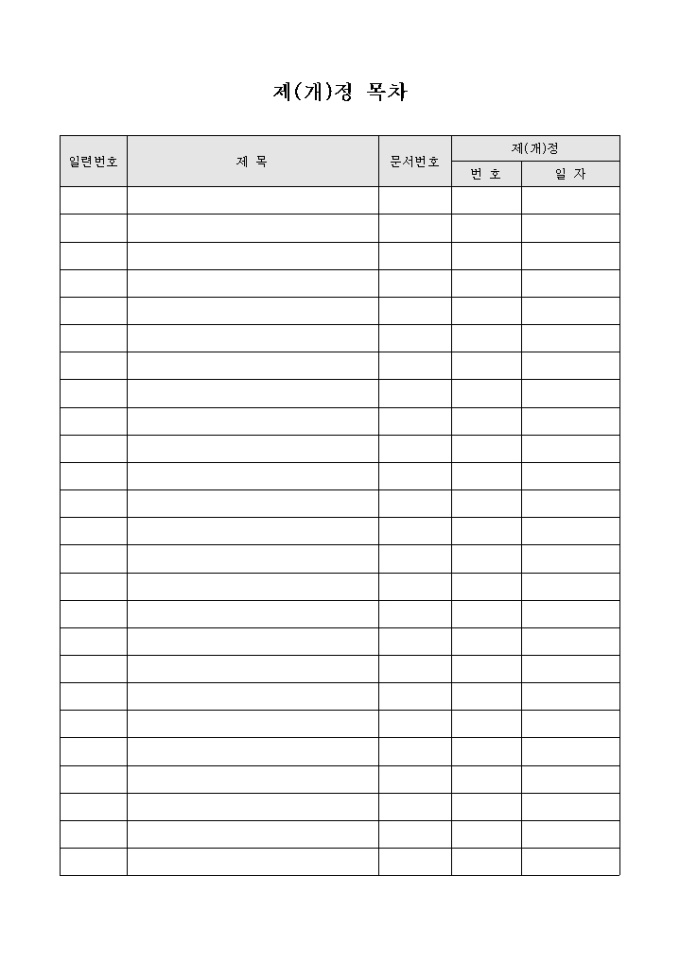 9,000원/월건축 관련 서식으로 일련번호, 제목, 문서번호, 제(개)정 번호와 일자를 기입할 수 있도록 만든 제(개)정 목차 양식입니다.