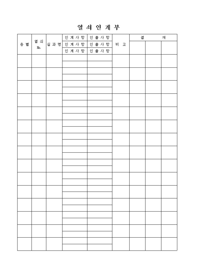 열쇠인계부 양식입니다. 인계사항과 인출사항등을 관리 하실 수 있는 양식입니다.