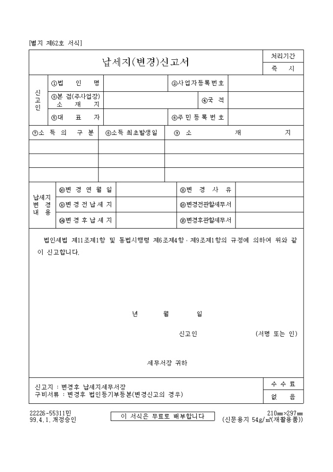 법인세법 제11조제1항 및 동법시행령 제6조제4항․제9조제1항의 규정에 의하여 위와 같이 신고하실때 사용하는 양식입니다.