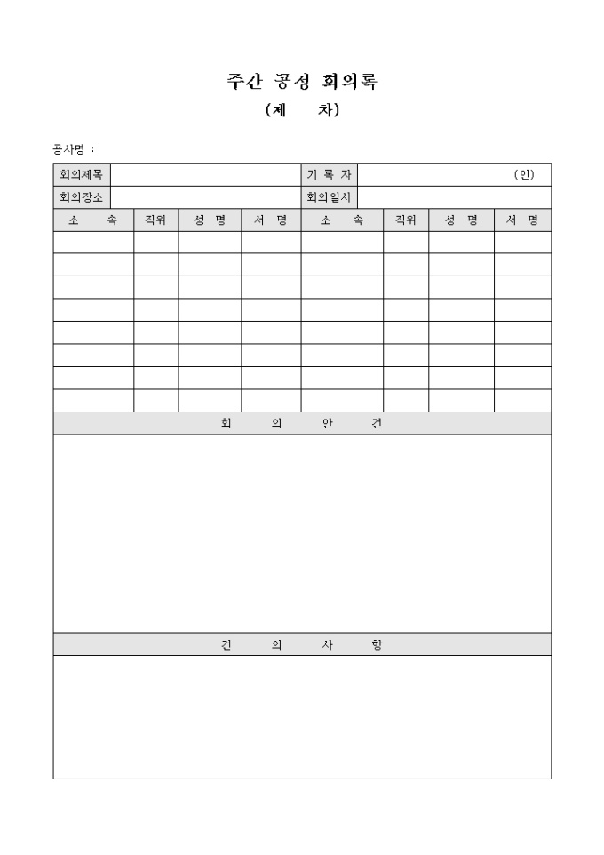 9,000원/월공사 관련 서식으로 회의제목, 기록자, 회의장소, 회의일시 및 참석자 명단을 기입하고 회의안건, 건의사항을 서술형태로 기입할 수 있도록 만든 주간 공정 회의록입니다.