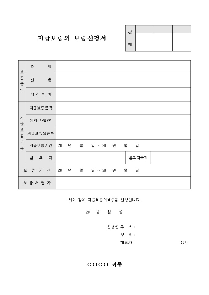 9,000원/월건축 관련 서식으로 보증금액의 총액, 원금, 약정이자 항목과 지급보증내용의 지급보증금액, 계약명, 지급보증의 종류, 기간, 발주자 및 보증기간, 보증채권자 사항을 기입하여 신청하는 지급 보증의 보증 신청서 양식입니다.