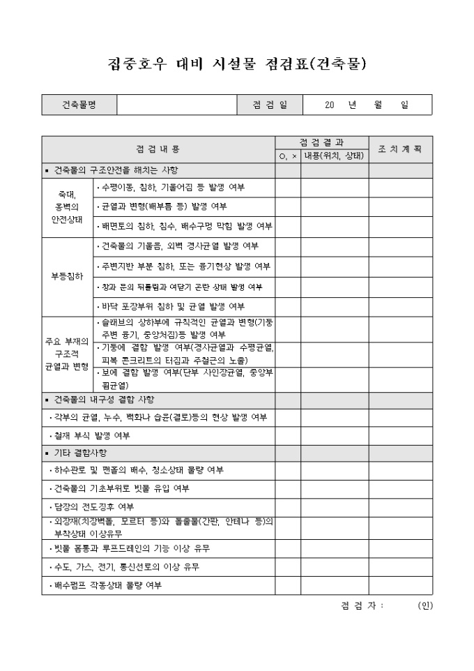 집중호우 대비 시설물 점검표(건축물)