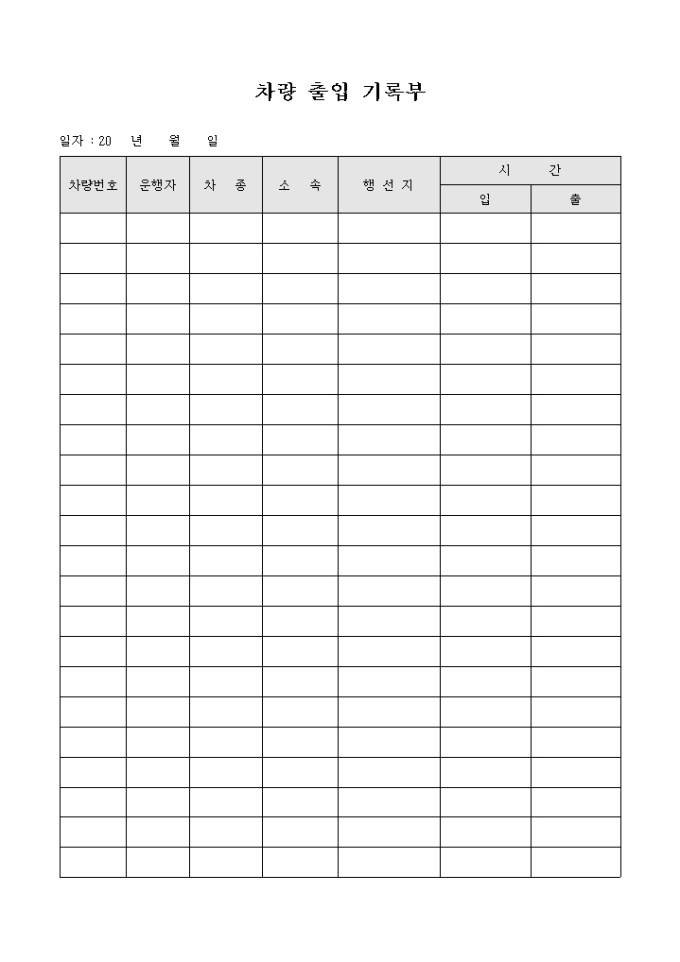 9,000원/월건축 관련 서식으로 차량번호, 운행자, 차종, 소속, 행선지, 입출 시간을 기입할 수 있는 차량 출입 기록부 양식입니다.