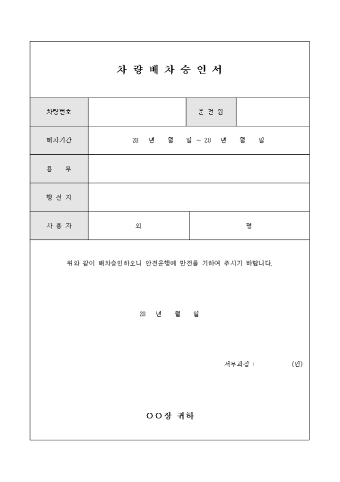 차량의 배차를 승인한다는 내용의 차량배차 승인서 양식입니다. 차량번호, 운전원, 배차기간, 용무, 행선지, 사용자 등의 항목으로 구성되어 있습니다.