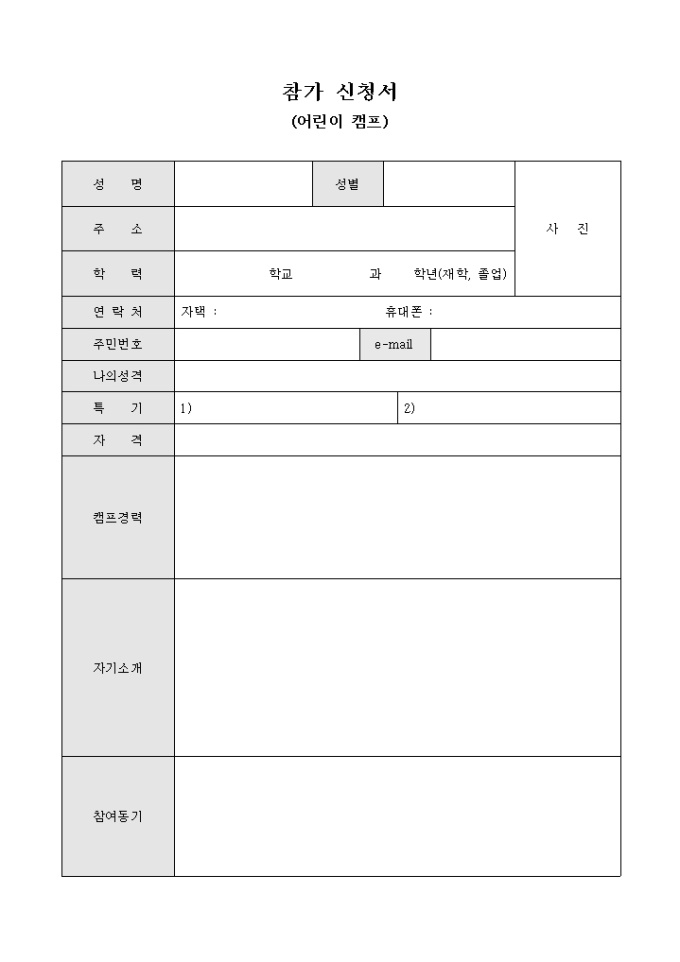 9,000원/월성명, 성별, 주소, 학력, 연락처, 주민등록번호, E-mail, 성격, 특기, 자격 등을 작성하고 캠프경력, 자기소개, 참여동기 등을 서술형태로 작성 가능한 캠프 참가 신청서 양식입니다.