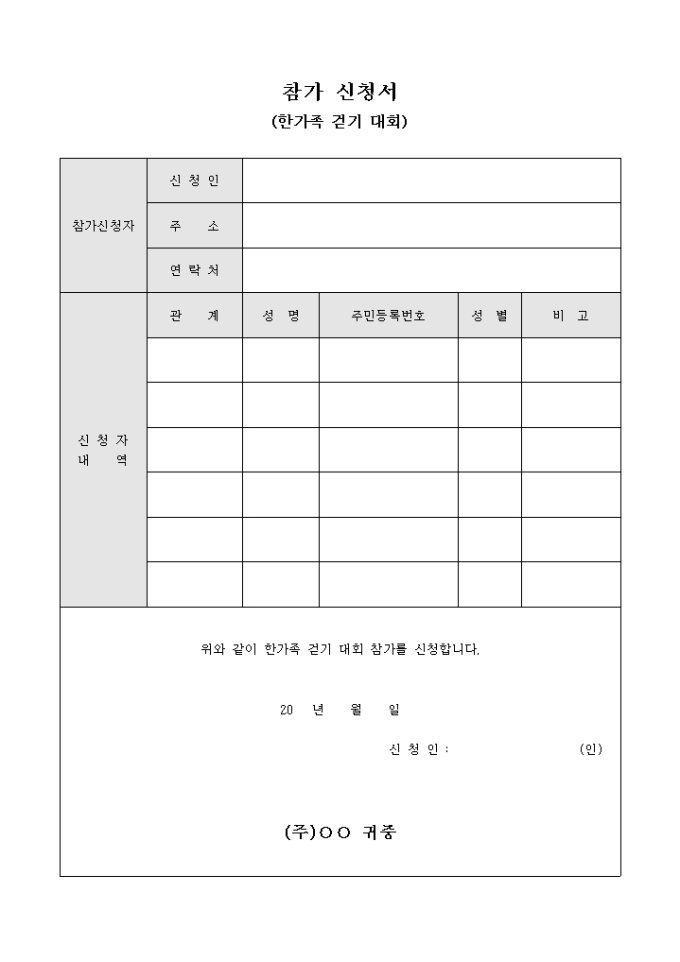 9,000원/월한가족 걷기 대회 참가를 희망하여 신청할 때 사용할 수 있으며 참가신청자 및 신청자의 내역을 기입하여 주최측에 제출할 수 있도록 작성된 서식입니다.