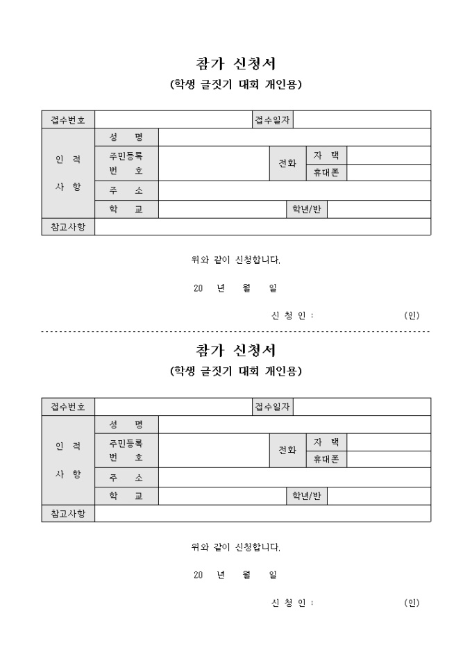 인적사항 및 학교, 학년/반 등을 기입하여 제출하는 참가 신청서 양식으로 2분할 되어 있습니다.